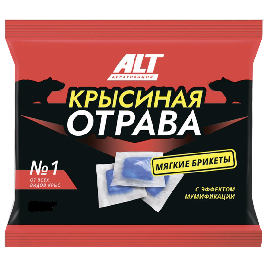 Средство родентицидное Крысиная отрава для уничтожения серых и черных крыс, домовых мышей, мышей полевок и других мышевидных грызунов на застроенных и незастроенных территориях населенных пунктов. Представляет собой готовую к применению приманку в виде мягкого брикета синего яркого сигнального цвета.